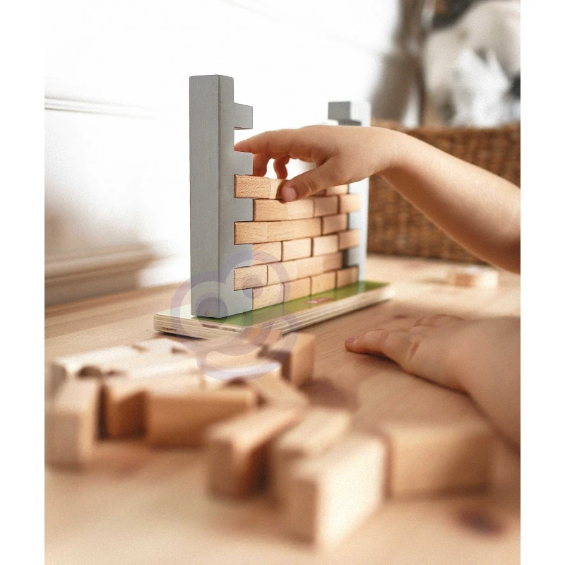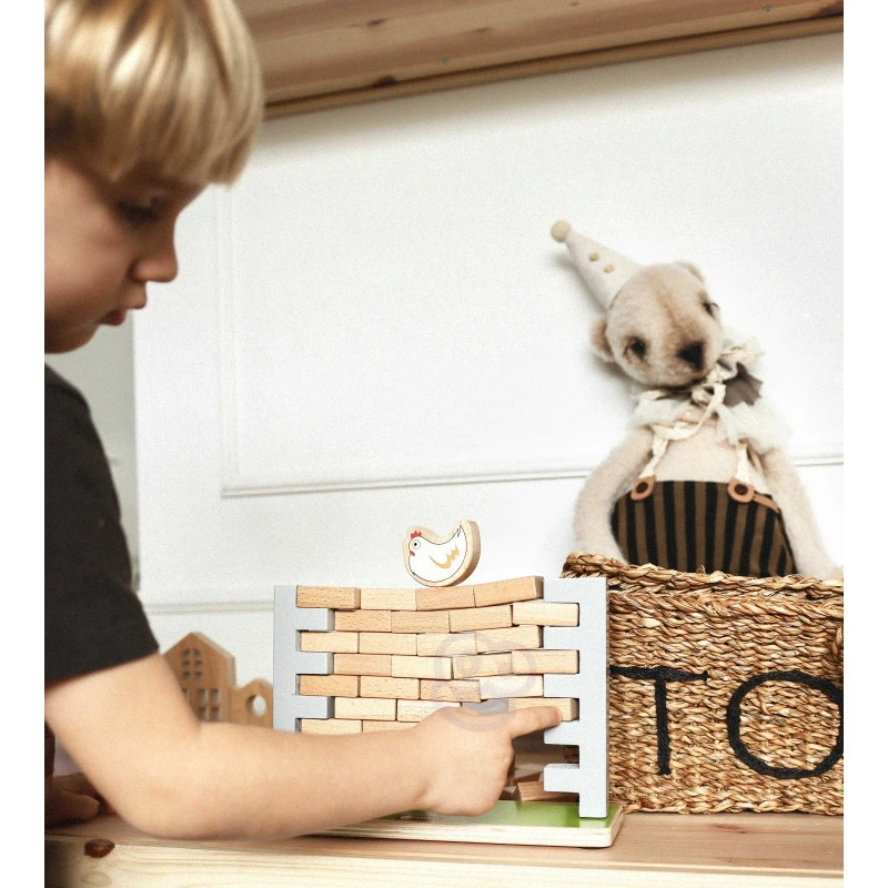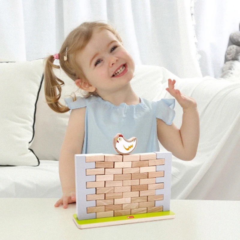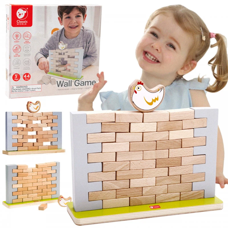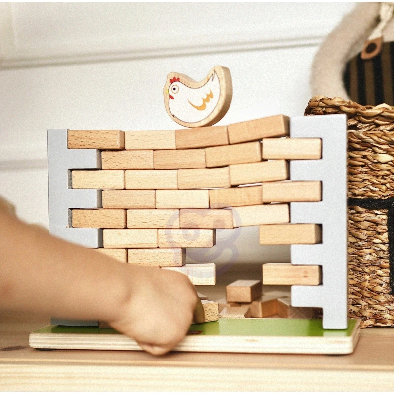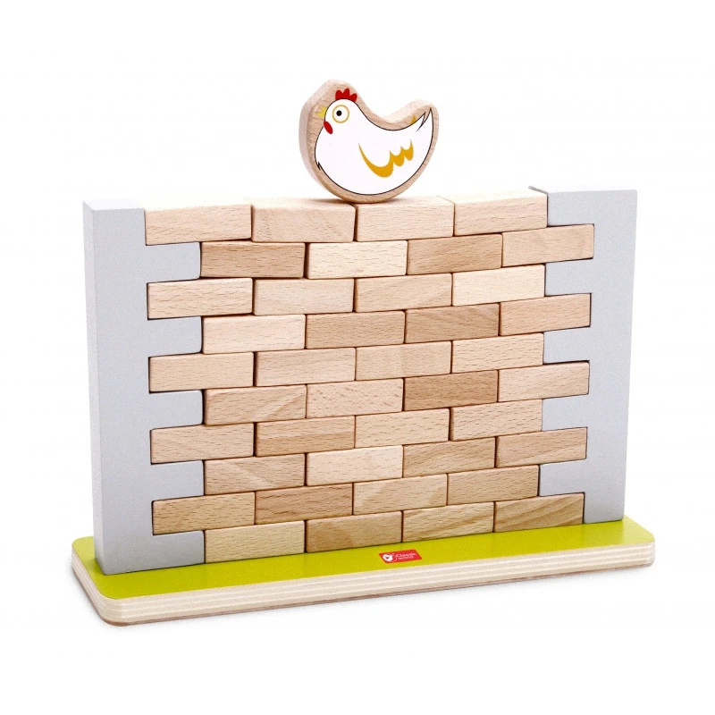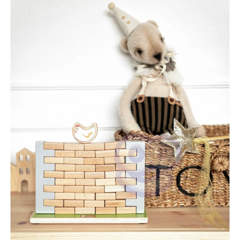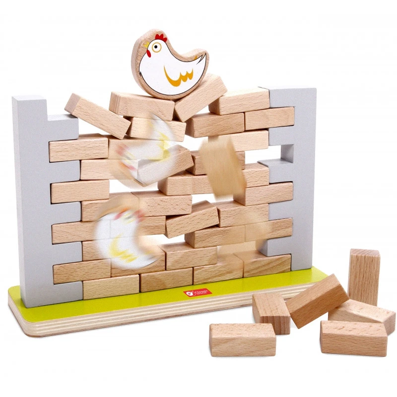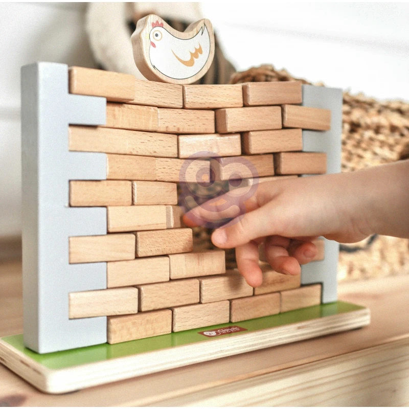 Skvelá drevená hra pre celú rodinu, známa svojimi jednoduchými pravidlami, logickým myslením a zábavou pre všetky vekové kategórie. Postavte stenu pomocou špeciálne pripravených blokov. Položte na ňu kuriatko a potom vyťahujte tehly zo steny jednu po druhej. Keď sa stena zrúti, hra končí. Počas hry sa vaše dieťatko naučí sústrediť sa, stratégiu a riešiť problémy, ako aj zlepšiť koordináciu ruka-oko.