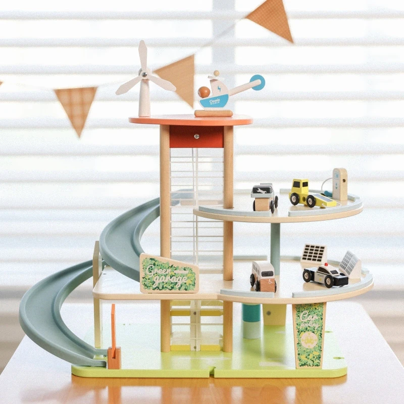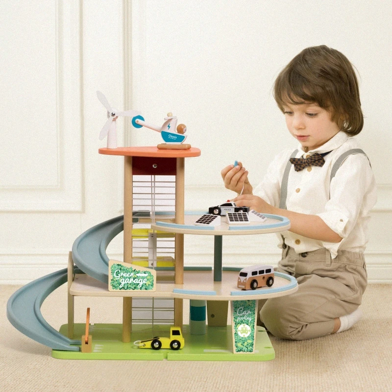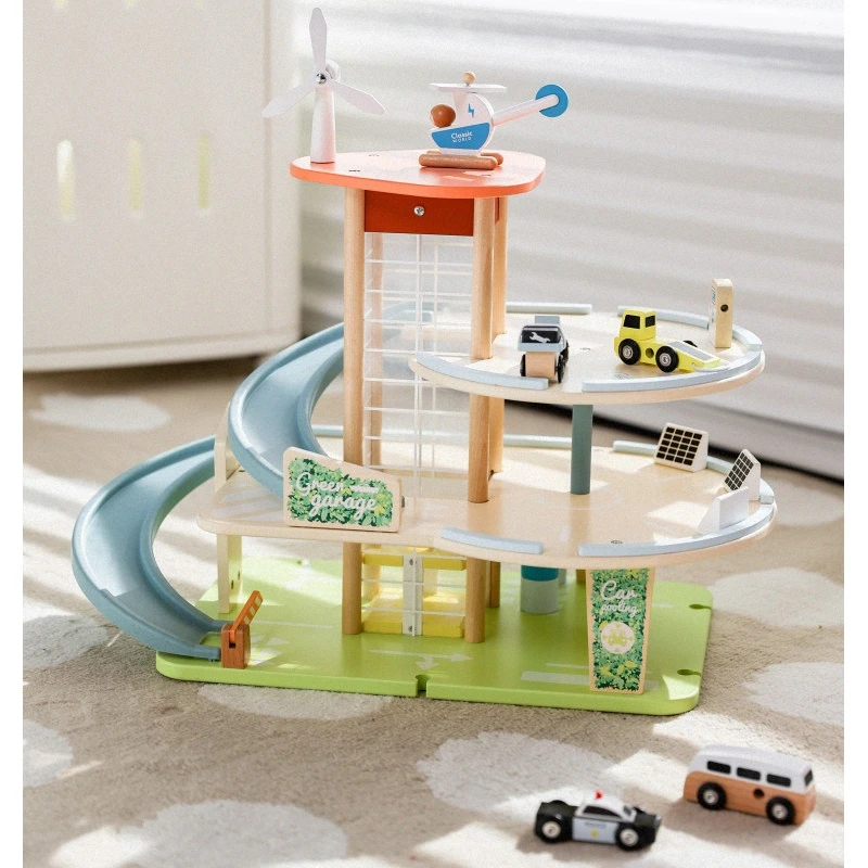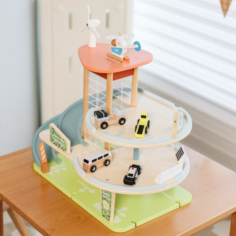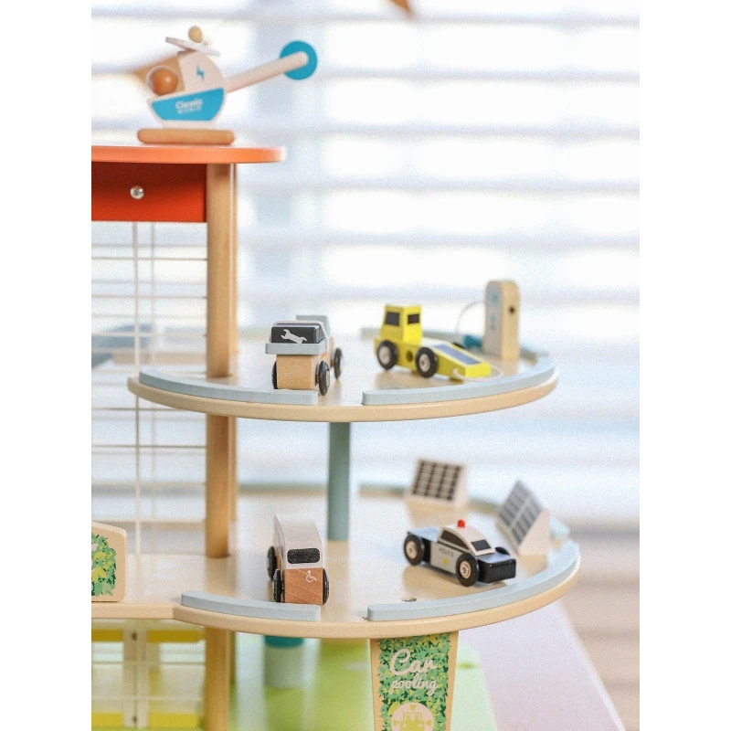 Táto 3-úrovňová parkovacia stavba s výťahom, solárnymi panelmi a veterným mlynom je viac než len hračka – je to vzdelávacie dobrodružstvo pre vaše dieťa. Je ideálna pre batoľatá od 3 rokov a rozvíja predstavivosť, koordináciu a environmentálne povedomie. Sada obsahuje 4 vozidlá vrátane vrtuľníka a odťahovky, pripravené na akciu. Pevná drevená konštrukcia zaisťuje odolnosť a estetiku a po hraní sa garáž stane ozdobou detskej izby.