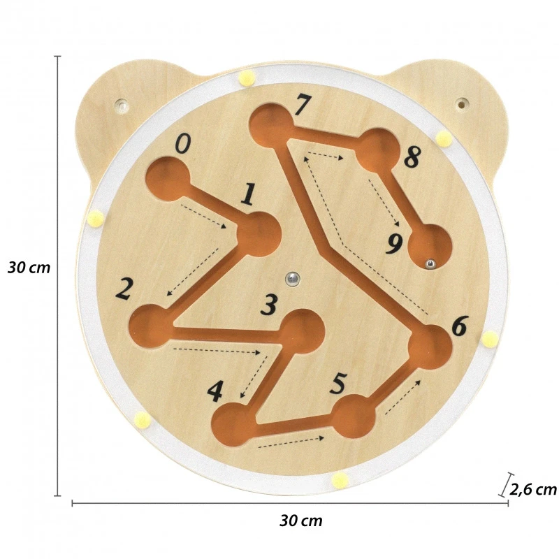 Jedna zo série drevených dosiek s rozkošnou hlavou plyšového medvedíka. Otočný ciferník na doske umožňuje oceľovej guľôčke dosiahnuť každú číslicu od 0 do 9. Táto hračka pomáha rozvíjať koordináciu ruka-oko, počítacie zručnosti a zručnosti v riešení problémov – čo je v neskoršom živote dôležité pre každého mladého človeka. Tento produkt je ideálny na domáce použitie aj pre vzdelávanie v ranom detstve. Zaujímavý dizajn dosky určite upúta pozornosť každého batoľaťa. Doska je vyrobená z lakovaného dreva a natretá netoxickými farbami v žiarivých farbách, ktoré potešia každého používateľa a poskytnú veľa zábavy pri hraní. Vhodné pre deti vo veku 18 mesiacov a viac. Naša ponuka zahŕňa celú sériu dosiek s hlavou plyšového medvedíka.