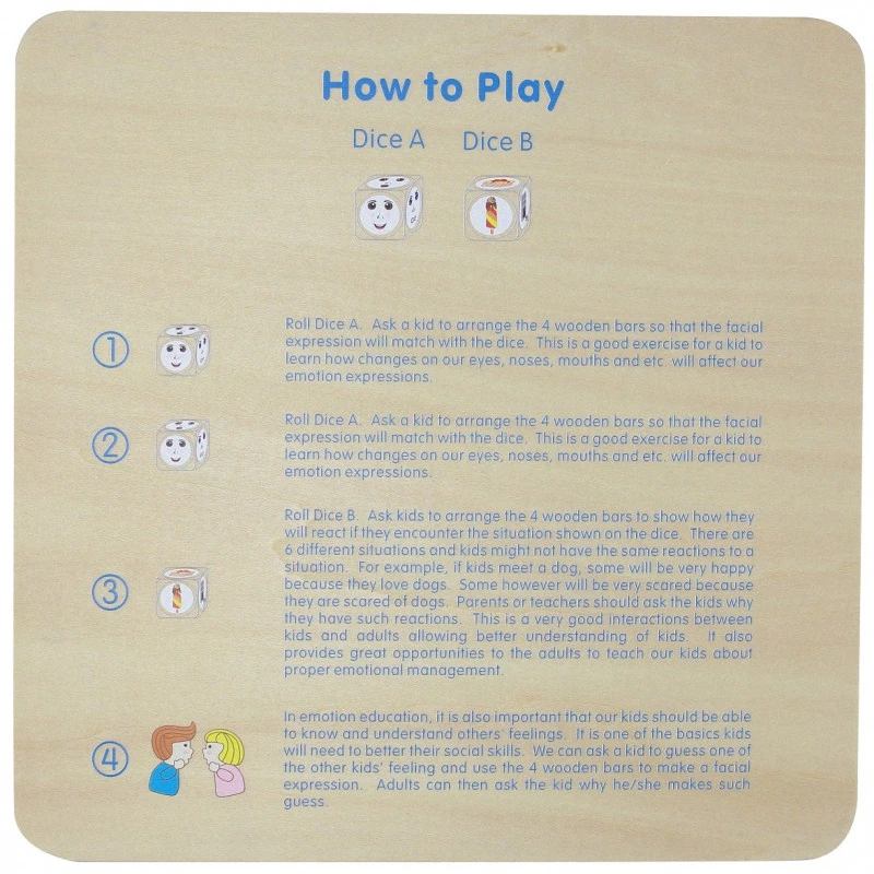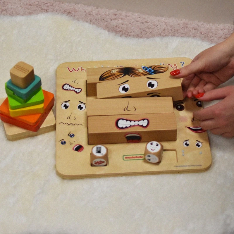 Tabuľa sa skladá zo 4 kociek,pomocou ktorých môže dieťa usporiadať až 64 rôznych tvárí vyjadrujúcich rôzne pocity. Cvičenia vykonávané s pomocou tejto dosky poskytujú skvelé príležitosti naučiť deti správne zvládať emócie, ako sa vysporiadať so svojimi emóciami, čo znamenajú. Produkt je vhodný na individuálnu prácu doma aj v špecializovaných kanceláriách.