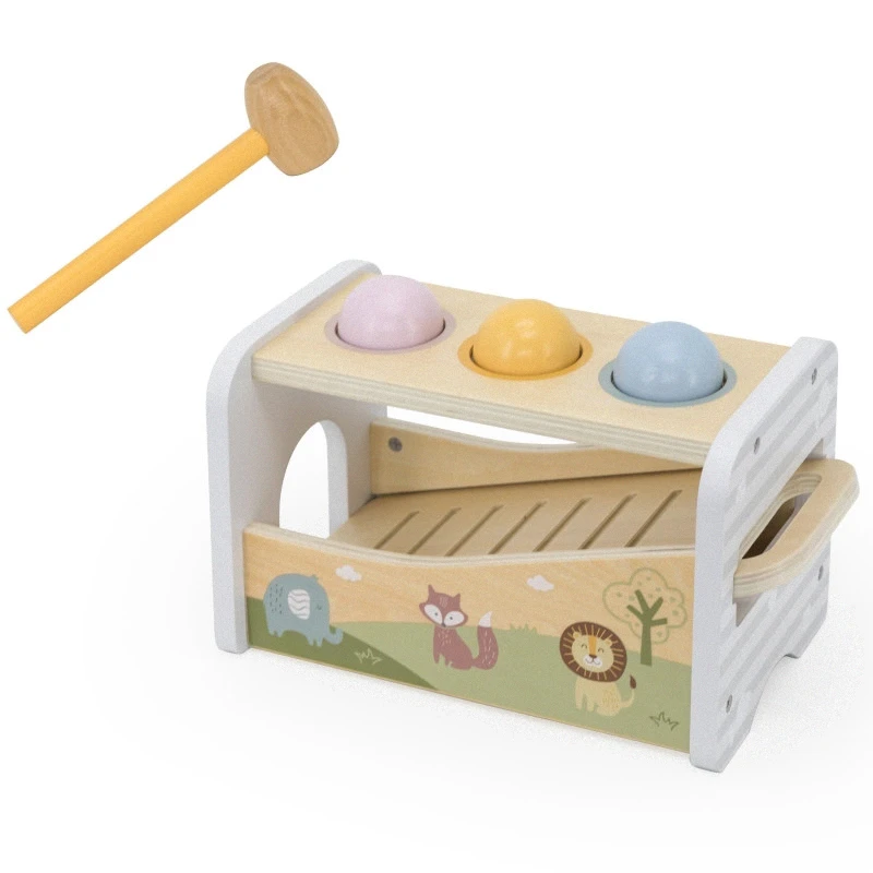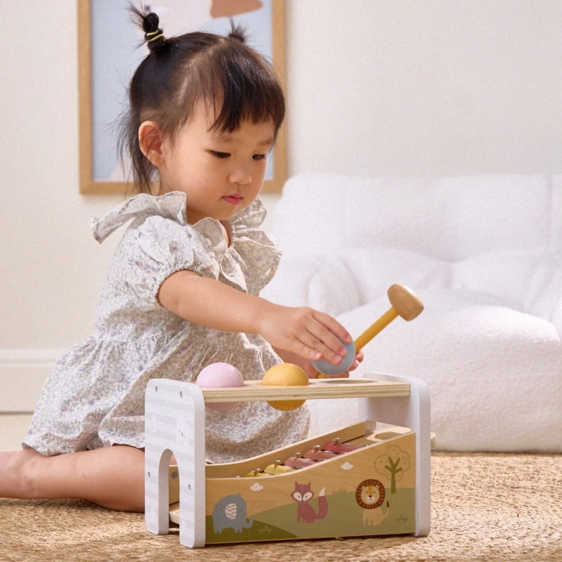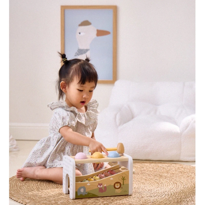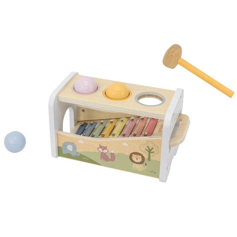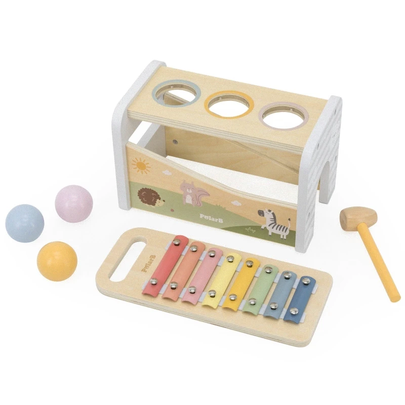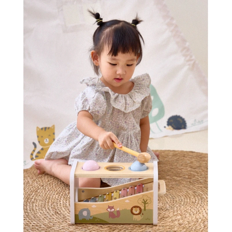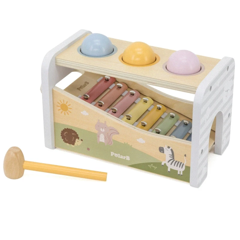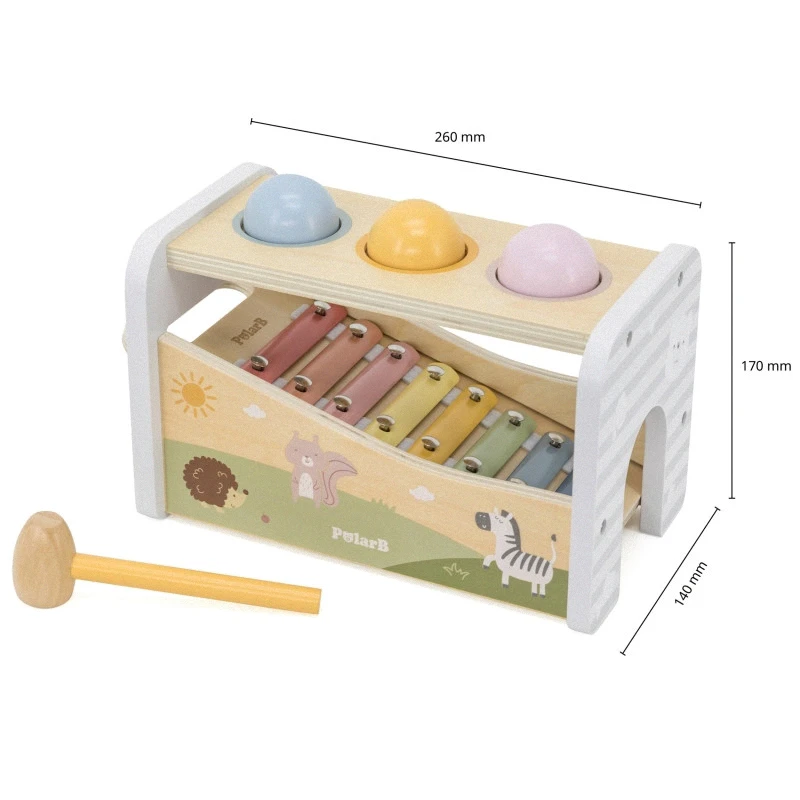 - Dve funkcie v jednej hračke – Udierajte do guľôčok kladivkom a sledujte, ako padajú na činely a vytvárajú jemné zvuky. Paličku môžete použiť aj na vytváranie vlastných melódií na farebných klávesoch!