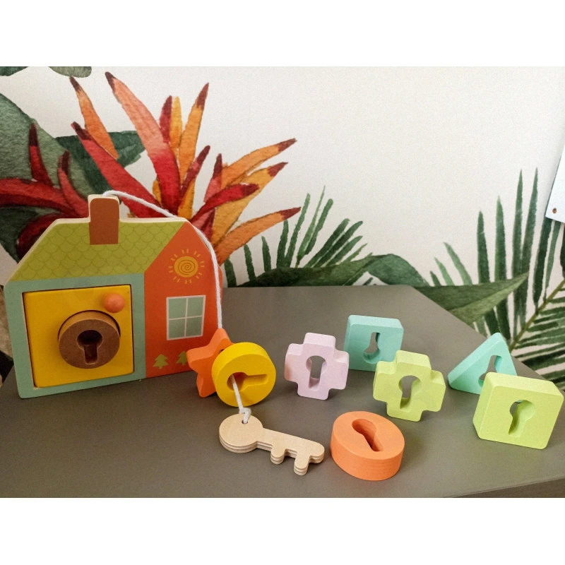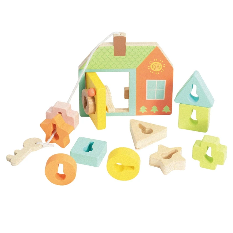 • sada pozostáva zo šnúrky s kľúčom, 11 kociek predstavujúcich rôzne tvary a dreveného domčeka,