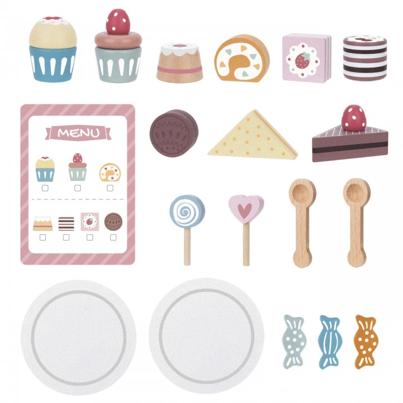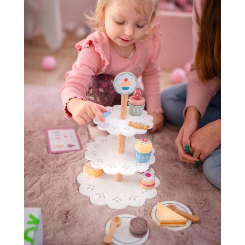 Sada obsahuje 18 drevených krajcov torty a ďalšie príslušenstvo, ako sú taniere a lyžičky, ktoré vám umožnia úplne sa ponoriť do zábavy s servírovaním dezertov. Hra pomáha rozvíjať sociálne zručnosti, komunikáciu a kreativitu a povzbudzuje deti, aby sa ujali úlohy hostiteľov a podávali sladké maškrty.