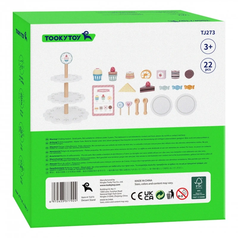 • sada obsahuje 22 prvkov vrátane: trojposchodového stojana na tortu, muffinov, kúskov torty, tanierov a lyžičiek.