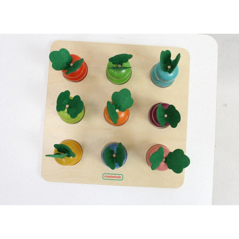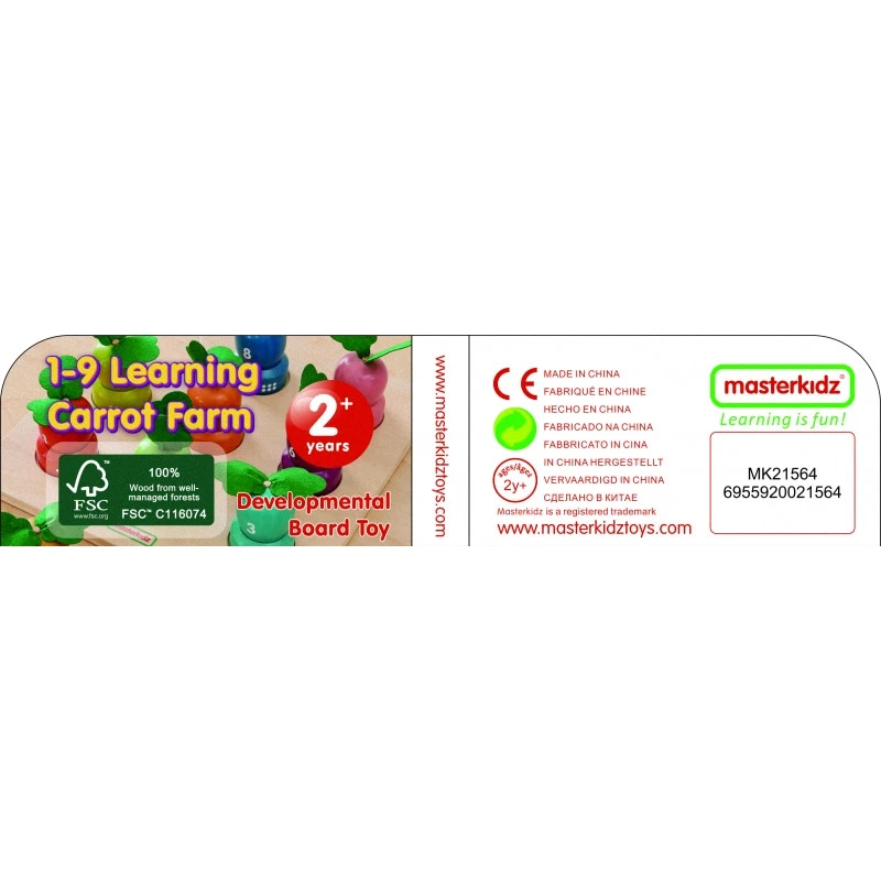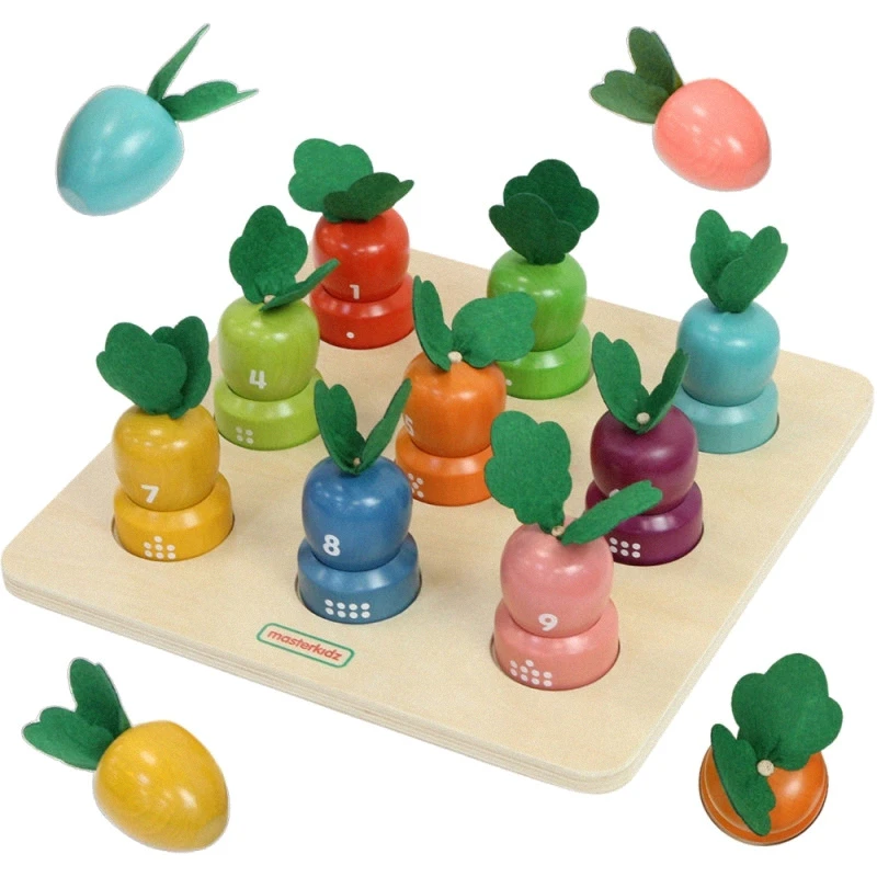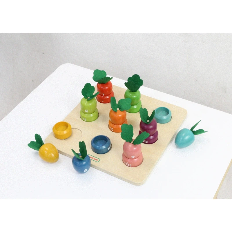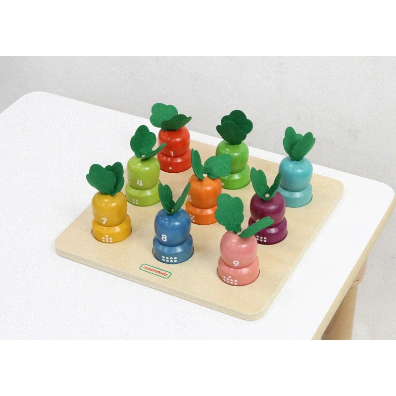 Drevená doska na učenie čísel a farieb. Táto doska je navrhnutá tak, aby deťom pomohla rozvíjať ich zmysly. Deti musia priradiť správnu zeleninu k počtu bodiek a farbe. Rozvíja tiež jemnú motoriku.