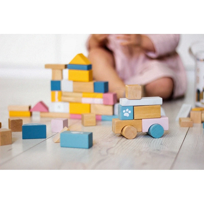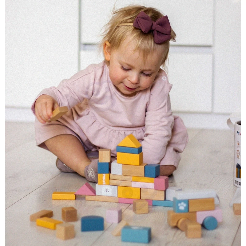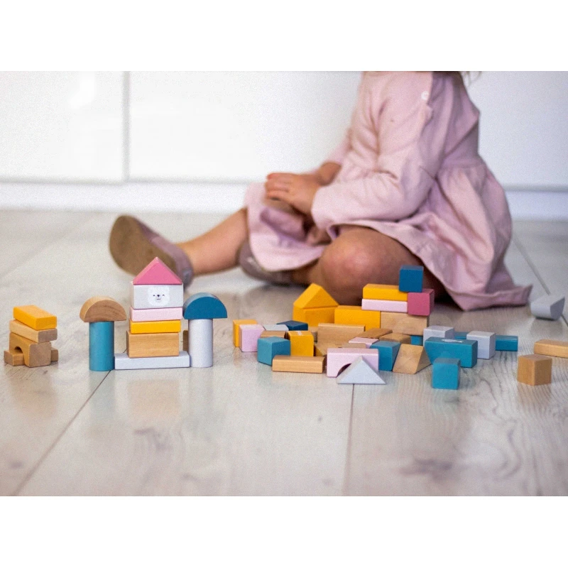 Bloky sú klasické hračky, ktoré efektívne rozvíjajú intelekt dieťaťa. Táto sada senzorických blokov podporuje konštrukčnú hru, cieľavedomé myslenie, kreativitu, riešenie problémov a základy STEM. Bloky tiež podporujú objavovaciu hru. Dieťa, ktoré dostane tieto rozmanité bloky, ich študuje a analyzuje zo všetkých uhlov pohľadu. Tento typ hry podporuje priestorové vnímanie, učenie sa farieb, tvarov, veľkostí a funkčnosti. Pre jednoduché skladovanie sú kocky umiestnené v plastovej krabici, aby bezpečne čakali na ďalšiu lekciu hrou v súlade s princípmi Montessori.