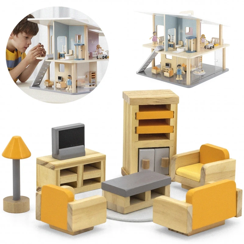 Táto sada nábytku do domčeka pre bábiky od renomovanej spoločnosti Viga je perfektným darčekom pre vaše dieťa. Séria obsahuje 5 rôznych izieb v rôznych farebných schémach. Vytvorte si vlastný domček pre bábiky a usporiadajte si nábytok a izby podľa vlastného uváženia. Produkt je vyrobený z vysoko kvalitných materiálov a s veľkým dôrazom na detail. Hračka je natretá netoxickými farbami v jemných farbách.