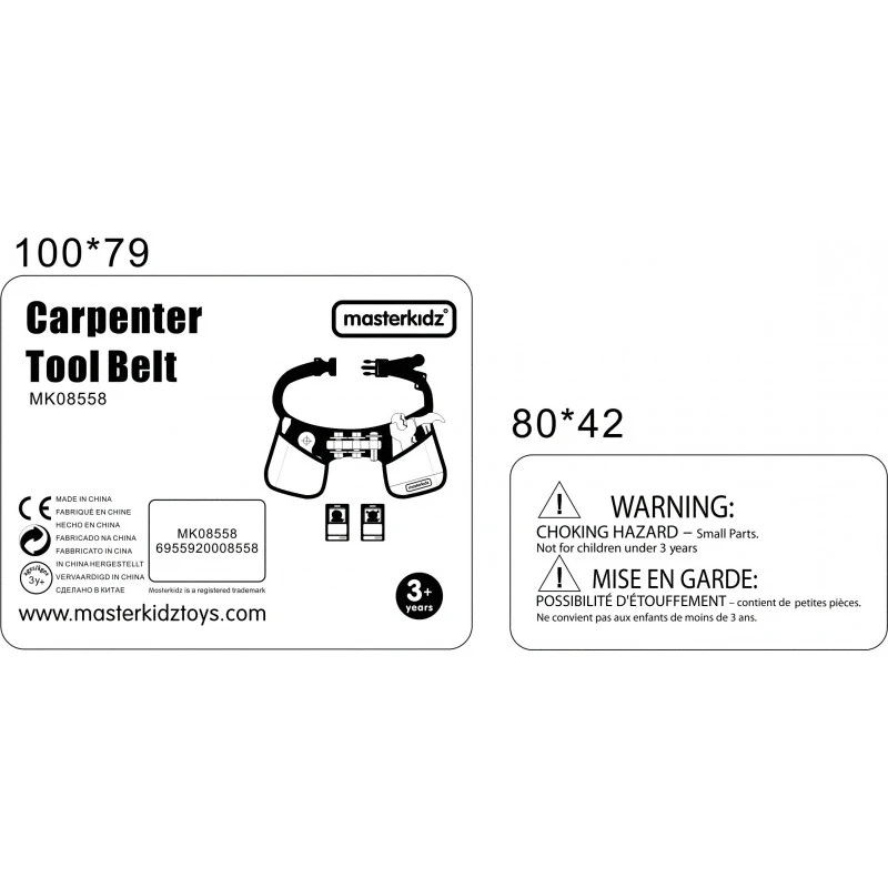 Látkový opasok a sada 12 kusov tesárskeho náradia. Sada umožňuje vykonávať všetky druhy tesárskych prác a obsahuje aj preukaz totožnosti pracovníka, na ktorý si dieťa môže napísať svoje meno a pripevniť fotografiu. Vaše dieťa sa bude cítiť ako skutočný profesionál, ktorý dokáže vyriešiť akýkoľvek problém!