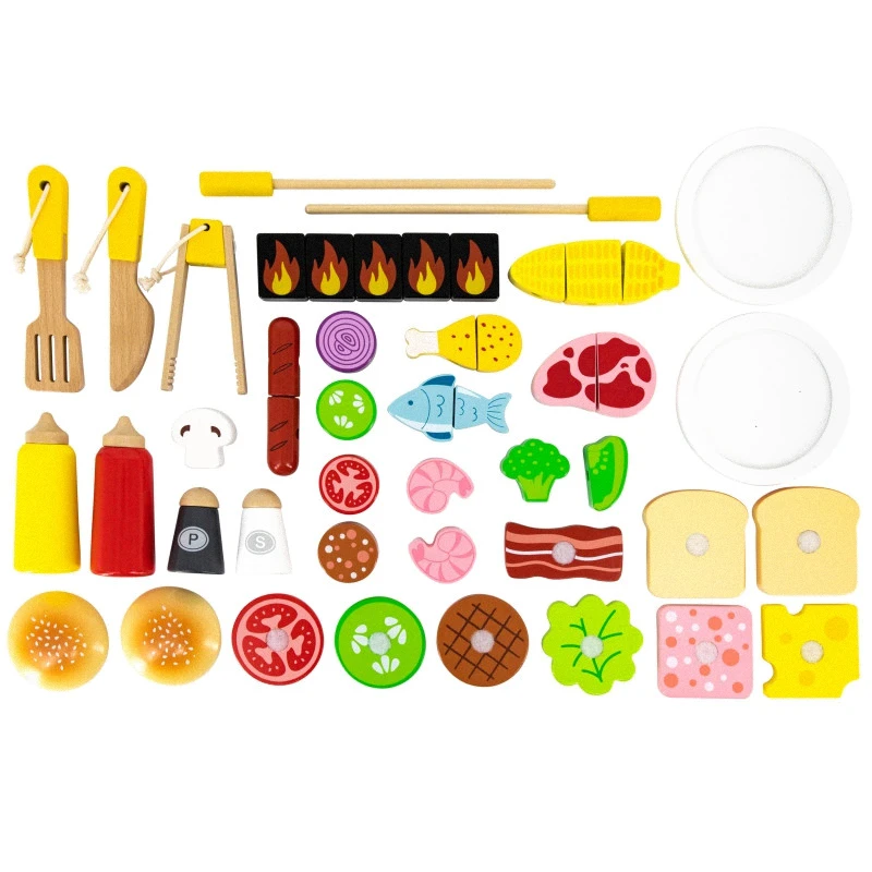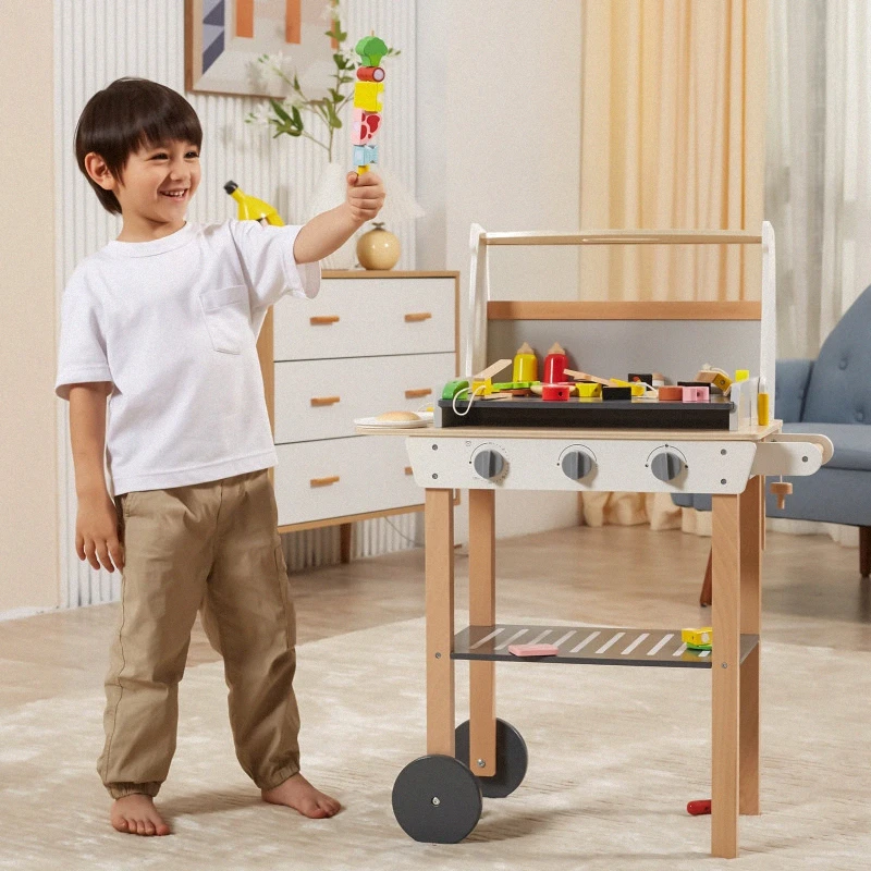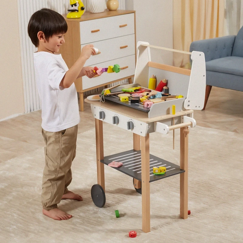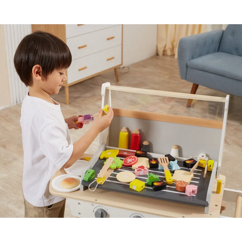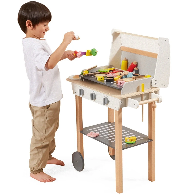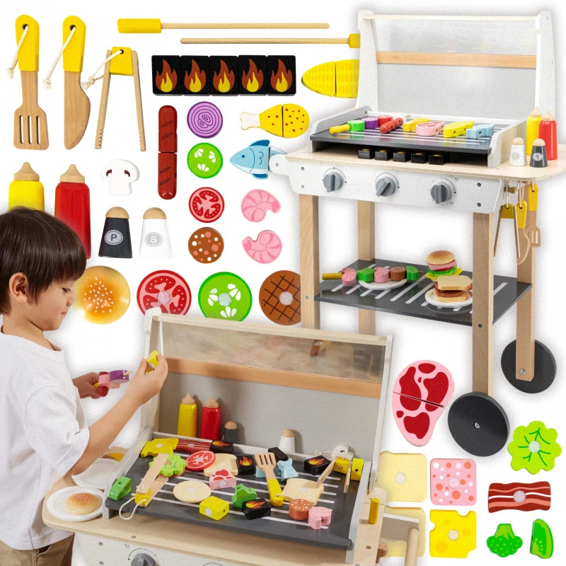Drevený gril na grilovanie! Sada obsahuje 47 doplnkov, ako sú dózy na koreniny, kečup, horčica, kliešte, príbory atď. Zvukové efekty dodávajú realizmus. Deti si môžu vytvoriť špízy, sendviče a hamburgery. Odnímateľné veko chráni „horúci“ rošt po grilovaní a kolieska a praktická rukoväť umožňujú prepravu grilu kdekoľvek v záhrade alebo doma. Dieťa sa bude môcť vžiť do úlohy dospelého, ktorý dohliada na rodinné grilovanie.